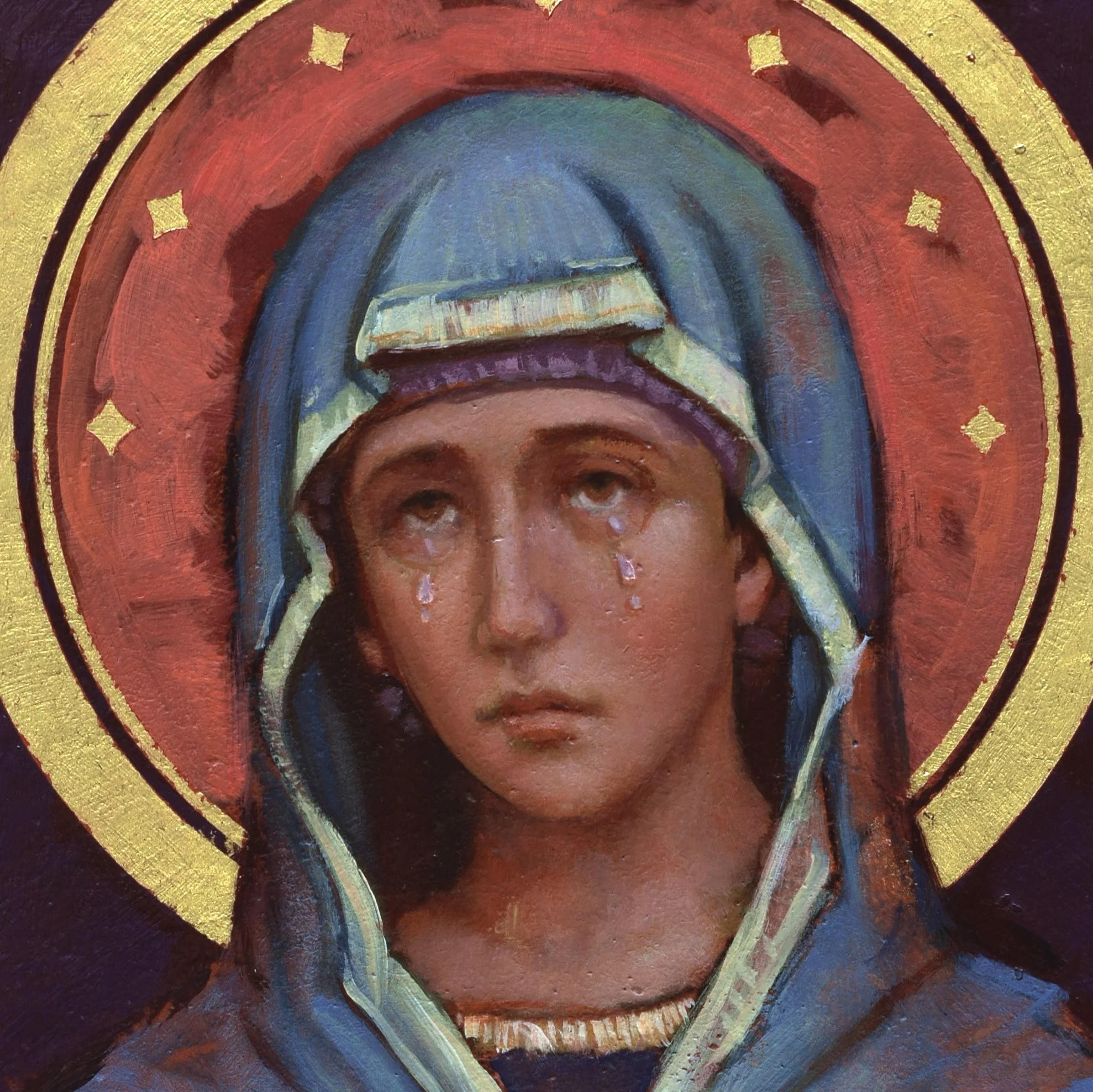 This portrayal of the Virgin Mary centers on the profound mystery of her interior sacrifice. Clad in the traditional blue of her humanity and the deep violet of mourning, she is depicted with the Sorrowful Heart—crowned with thorns and pierced by a sword—symbolizing her participation in the passion of her Son. Her upward gaze and visible tears reflect a grief that is not despairing, but intercessory, bridging the gap between earthly suffering and heavenly hope. The gold leaf of the halo and the sacred heart serve as a theological reminder that in the economy of grace, profound sorrow is often the site of the most radiant transfiguration.