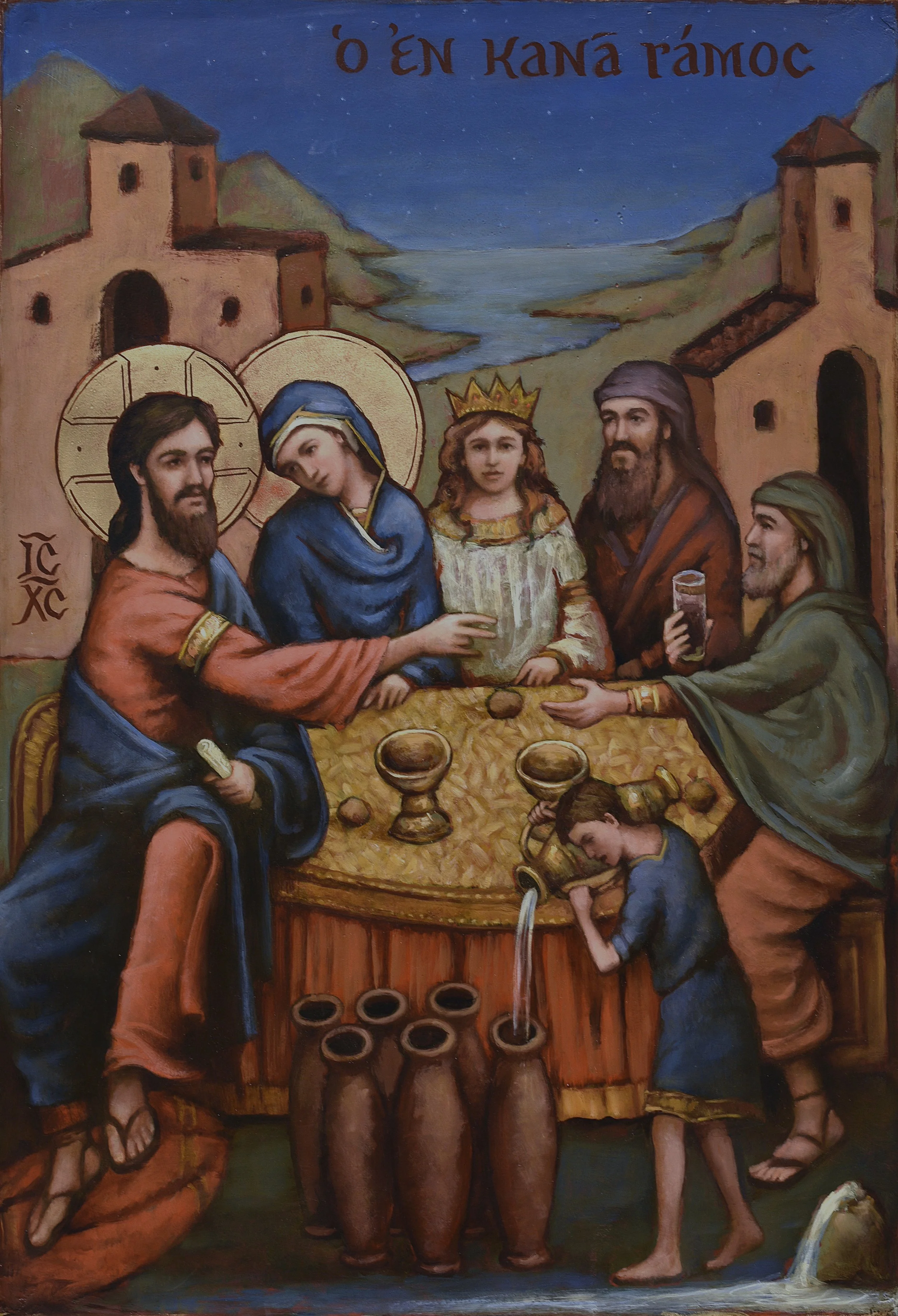 This painting by Joshua Adam Risner is a contemporary iconographic depiction of the Wedding at Cana, the biblical event where Jesus performed his first miracle. The composition centers on a festive table where Christ, identified by a cruciform halo and the traditional "IC XC" christogram, sits at the left, gesturing in blessing toward the large earthen jars in the foreground. Beside him is the Virgin Mary, leaning in intimately, while the crowned bride and groom sit opposite them. A servant in the lower right pours water into the vessels, capturing the moment of transformation into wine. Above the scene, the Greek inscription "Ο ΕΝ ΚΑΝΑ ΓΑΜΟΣ" (The Wedding in Cana) is set against a deep blue sky, while the stylized architectural background and gilded border firmly root the piece in the tradition of sacred art.